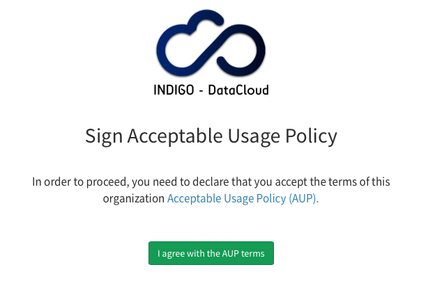 The AUP can be created by clicking on the “Create AUP” button in the AUP management page (that can be reached clicking the “AUP” link in the organization Management navigation bar):